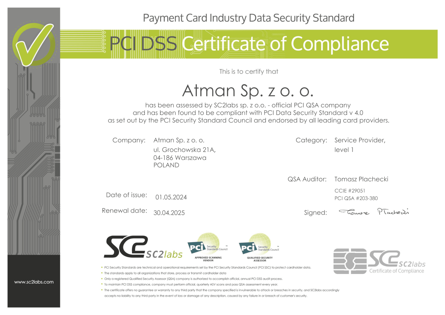 PCI DSS (Payment Card Industry Data Security Standard) to międzynarodowa norma określająca zasady ochrony danych posiadaczy kart płatniczych. Certyfikacja zgodności gwarantuje, że Atman stosuje najwyższe standardy bezpieczeństwa w zakresie przechowywania, przetwarzania i przesyłania danych kart płatniczych. Jest to szczególnie istotne w kontekście świadczonych przez nas usług kolokacyjnych – klienci mogą mieć pewność, że ich dane w Centrach Danych Atman są chronione na najwyższym poziomie.