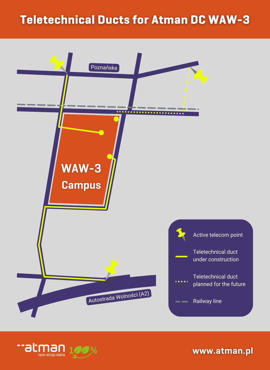 In August, we signed a contract for the construction of 2 teletechnical ducts for Atman DC WAW-3. Connecting the new campus to the world is the next stage of our latest data center investment.