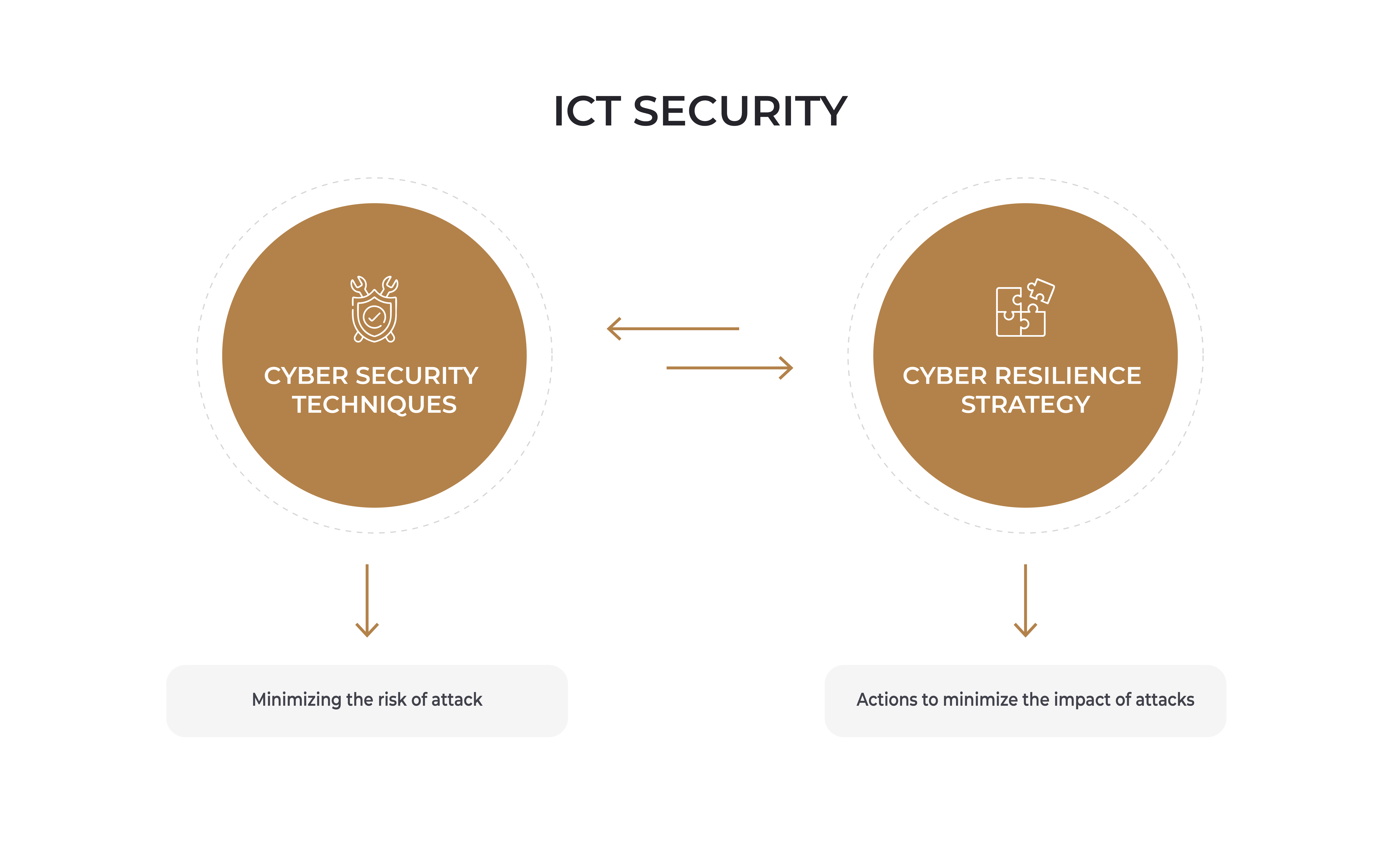 The range of defensive measures that ensure business continuity and protect against breaches of data integrity (and confidentiality) is constantly growing. Their use determines the ability to avoid the growing cyber threat. They are complemented by measures to build digital resilience, i.e. the ability to limit the damage if the security of the ICT system is nevertheless compromised. Cyber resilience addresses all external and internal threats and requires an understanding that no digital protection system is perfect (even with full vendor support and installation of updates).ICT SecurityIn summary, cybersecurity techniques aim to minimize the risk of an attack, and a cyber resilience strategy includes measures to minimize the impact of attacks. The more closely these two categories are linked, the more comprehensive an organization’s approach to ICT security will be.