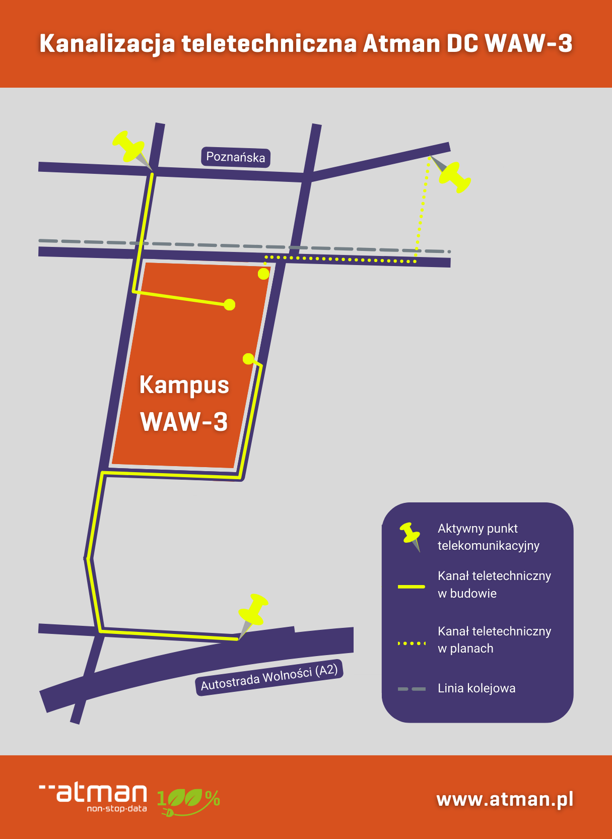 Atman zastosuje kable światłowodowe 144J gwarantujące niskie tłumienia. Połączenia między WAW‑3 a WAW‑1 (Praga-Południe), WAW‑2 (Mokotów) i LIM (Śródmieście) będą przebiegać najkrótszymi trasami, zapewniając niskie opóźnienia (low latency). WAW‑3 stanie się częścią nowoczesnej sieci DWDM Atmana, która łączy wszystkie znaczące centra danych działające w aglomeracji warszawskiej.