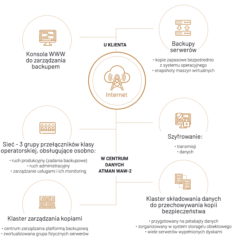 Komunikacja pomiędzy Twoimi serwerami a platformą Atman Backup odbywa się przez Internet (używamy tylko jednego portu TCP).